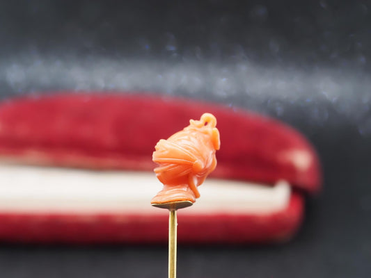 Estate Victorian 18K Yellow Gold French Carved Coral KNIGHT in Armor Stick Pin