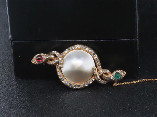 Victorian Double Serpent Rose Cut Diamond, Emerald and Ruby Brooch - VHK#341a