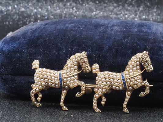 Estate 1900s 14K Yellow Gold Horse Brooch with Sapphire and Pearls - VHK#653a