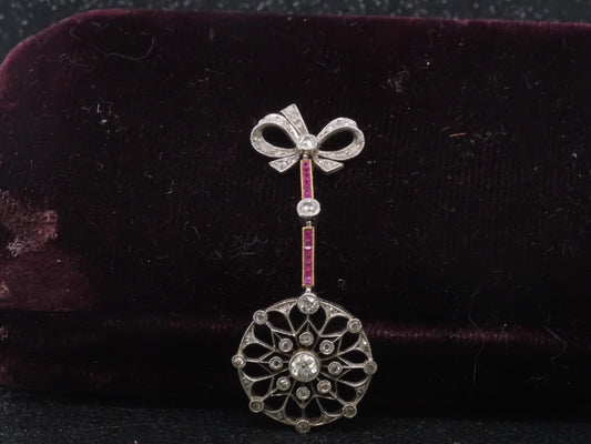 Edwardian Old European Diamond and Ruby Drop Pendant in Gold and Platinum - VHK#1005