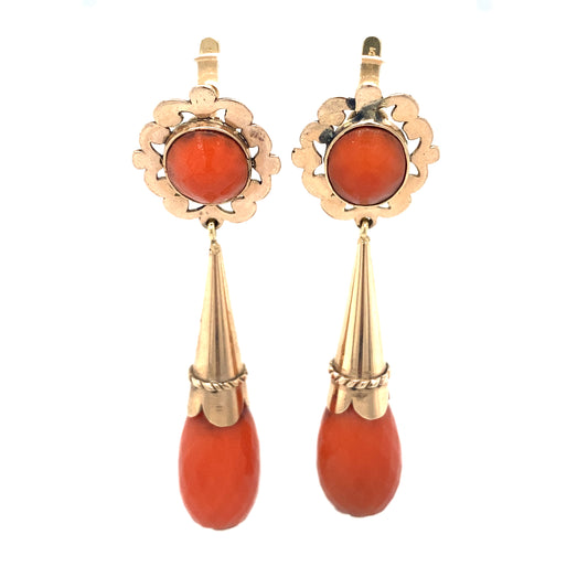 Circa 1890s Victorian Faceted Coral Dangle Earrings in 14K Gold