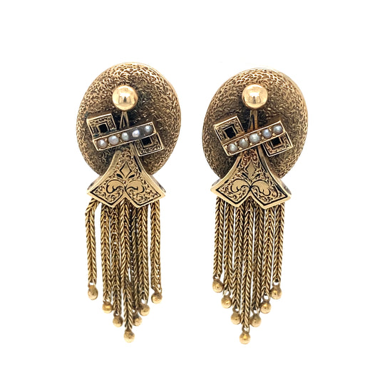 Circa 1870s Victorian Oval Seed Pearl Earrings with Tassels in 14K Gold