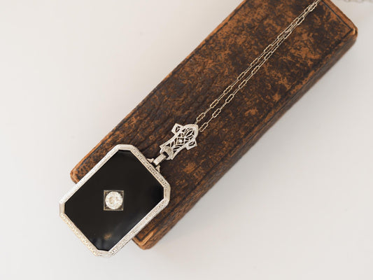 Circa 1920s Art Deco Onyx and .65ct Old European Diamond Necklace Pendant
