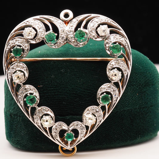 18K Gold and Platinum Top Edwardian Emerald and Old Mine Cut Diamond Pendant with Brooch Attachment