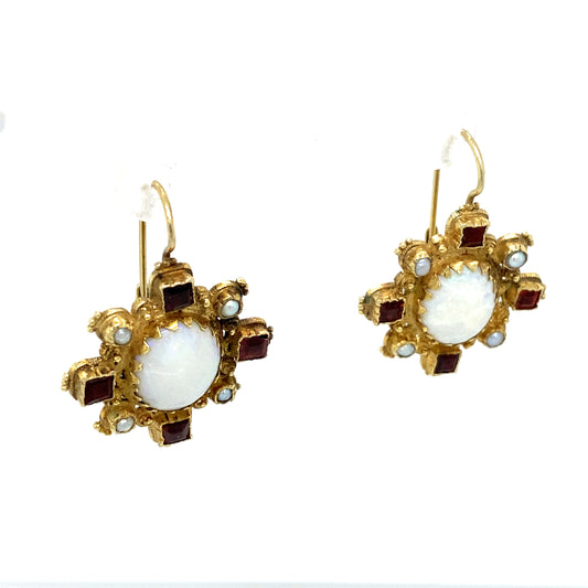 Circa 1960s Garnet, Opal and Pearl Dangle Earrings in 14K Gold