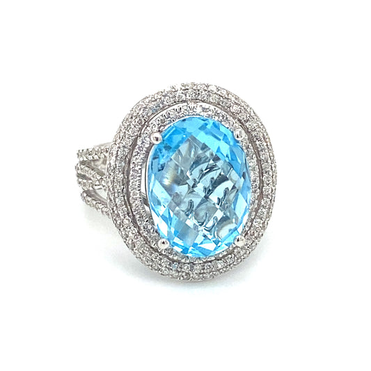Circa 2000s Large Oval Blue Topaz and Diamond Cocktail Ring in 14K White Gold