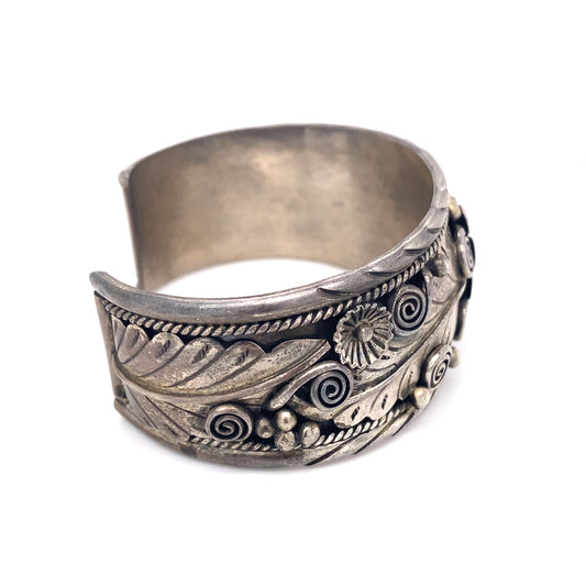 Circa 1970s Flower Design Cuff Bracelet in Sterling Silver Marked Parlos