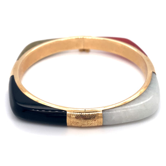 Circa 1980s Geometric Dyed Jade and Quartz Hinged Bangle in 14K Gold