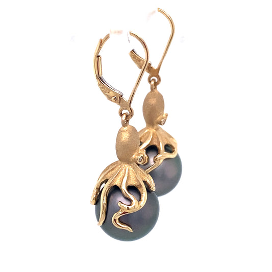 Circa 1990s Octopus Motif Tahitian Pearl Earrings with Diamonds in 14K Gold