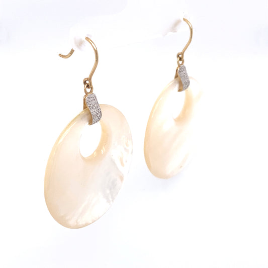 Circa 1980s Mother of Pearl and Diamond Circle Dangle Earrings in 14K Gold