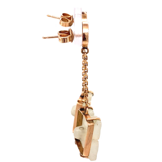 Circa 1970s White Jade Dangle Earrings with Lucky Symbol in 14K Gold
