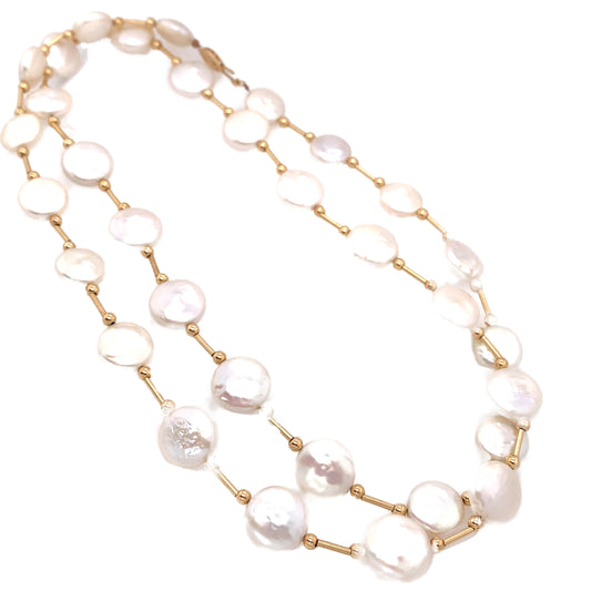 Circa 1960s 30 Inch 12mm Coin Pearl Station Necklace in 14K Gold
