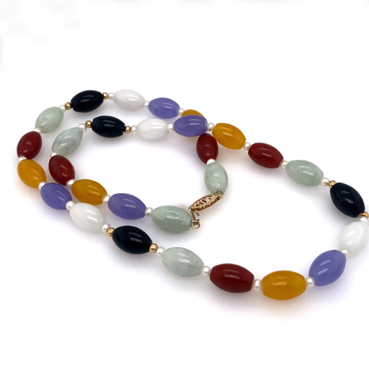 Circa 1950s Multicolored Jade Beaded Necklace with Pearls in 14K Gold