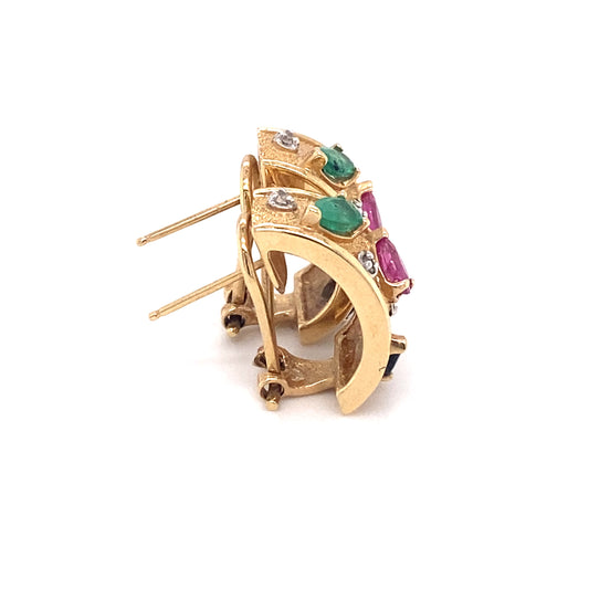 Circa 1970s Tutti Frutti Sapphire, Ruby, Emerald and Diamond Half Hoop Earrings