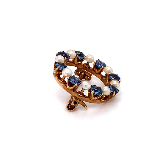 Circa 1890 Montana Sapphire and Pearl Circle Pin in 14 Karat Gold