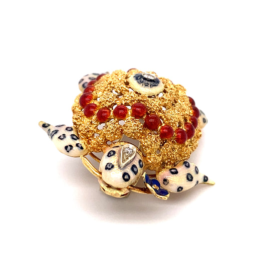 Circa 1970 Multicolored Enamel and Diamond Italian Turtle Brooch in 18K Gold