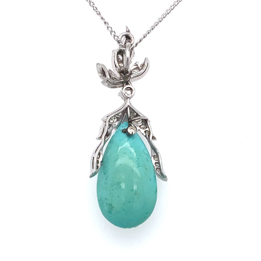 Circa 1940 Turquoise and Diamond Drop Pendant in 18 Karat White Gold