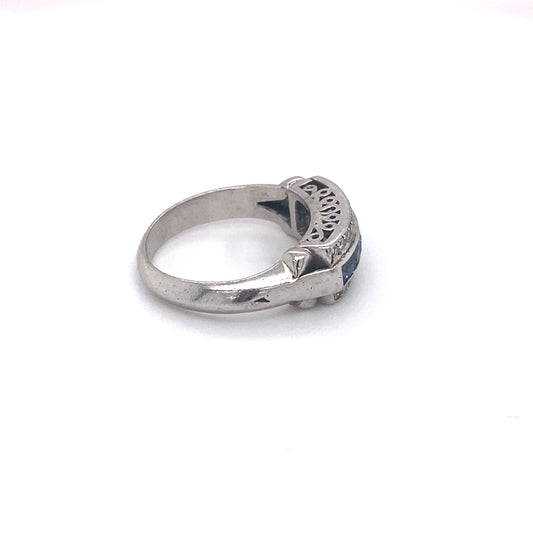 1920s Antique Three Row Diamond and Square Sapphire Ring in Palladium