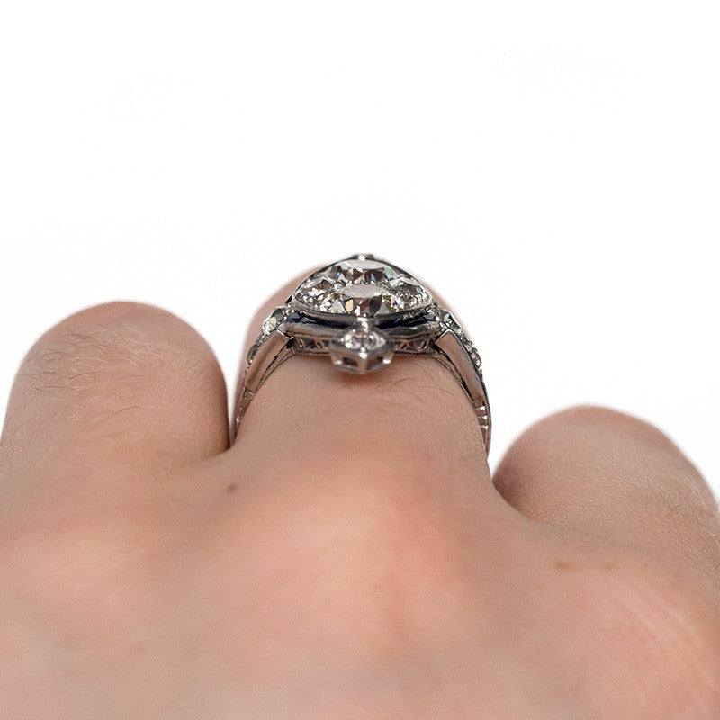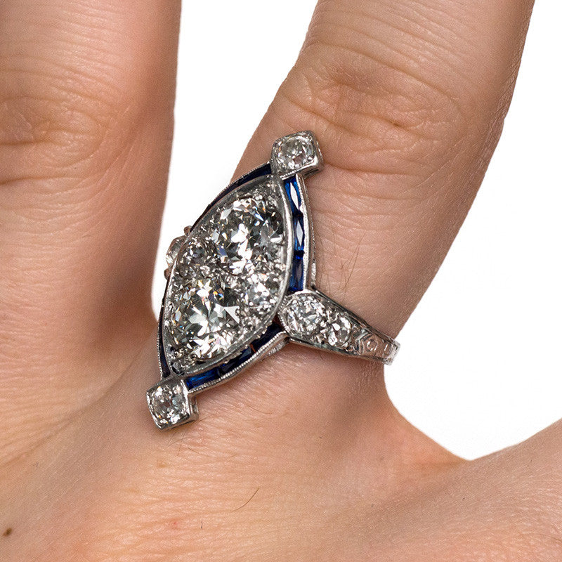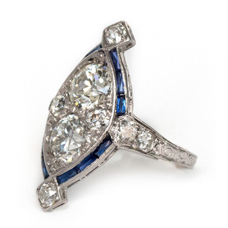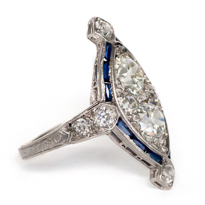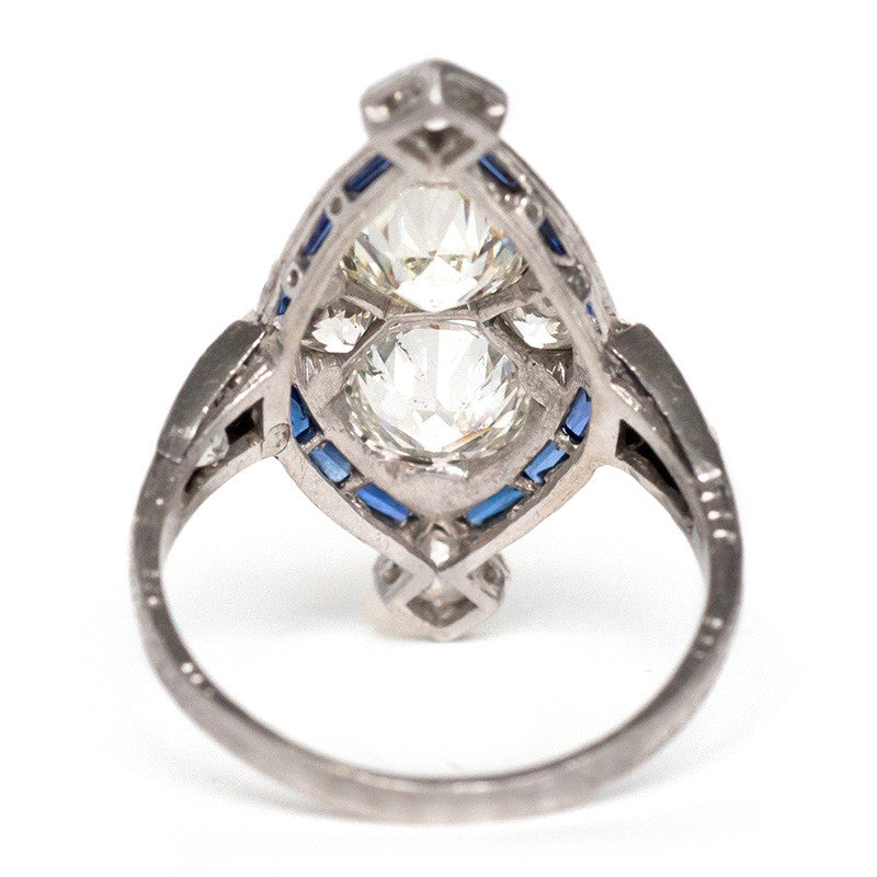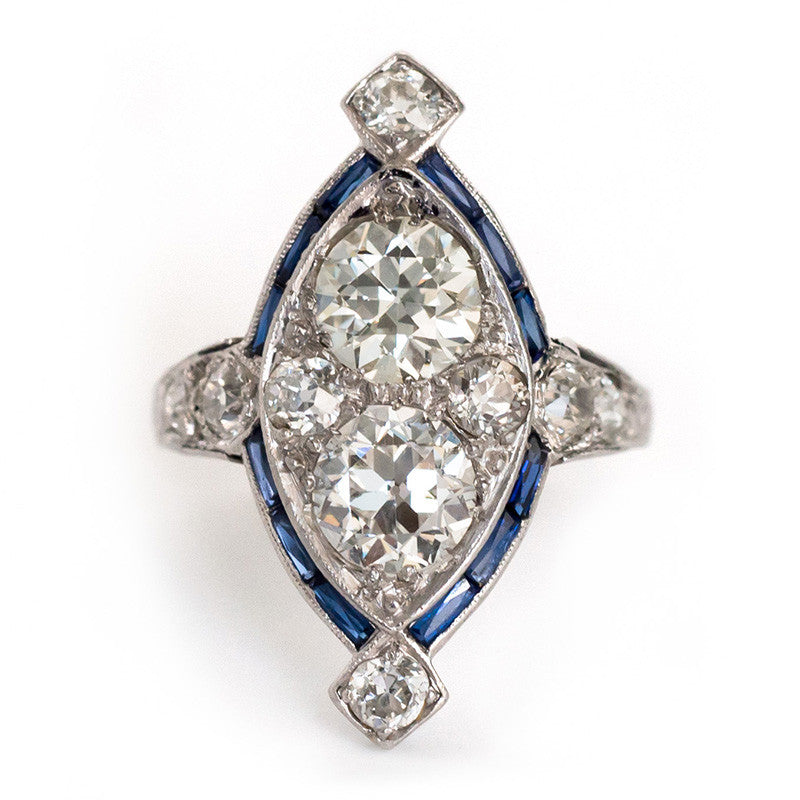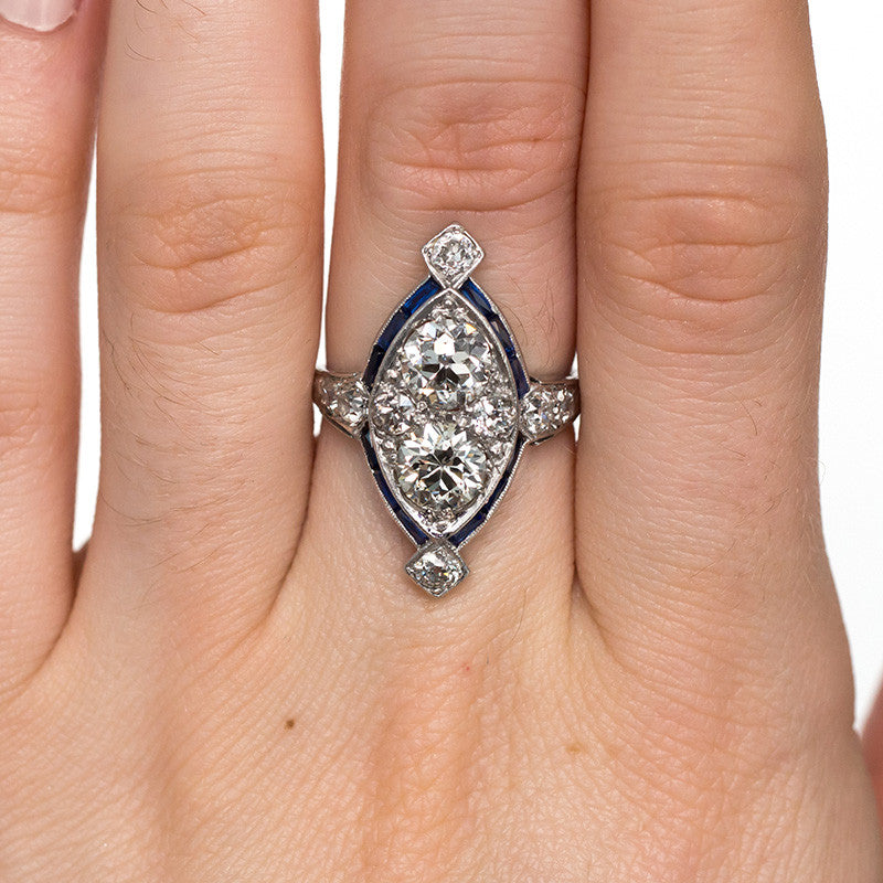 If this one doesn't leave you speechless, we don't know what will! This piece is absolutely amazing. The ring is handcrafted in platinum with light metal engraving work around the upper 1/2 of the band. There is a halo of french cut natural sapphires which are arranged in a marquise shape. There are 8 old european cut side stones which are approximately 1.00ct total weight, and extremely clean and white. The quality of these side stones are awesome, and the cutting pattern really gives a great fire and brilliance which each movements of the ring. Now we can speak on the two large center stones. The first diamond is a GIA certified old european cut diamond of 1.08ct, with a color of J and clarity of SI1. The second GIA certified diamond is an old european cut weighing 1.01ct with a color of G and clarity of SI2. These two diamonds are of uber high quality and both have amazing fire and brilliance. All in all, this ring is truly amazing, and a one of a kind antique engagement ring. The two diamonds signify the unions of two partners.