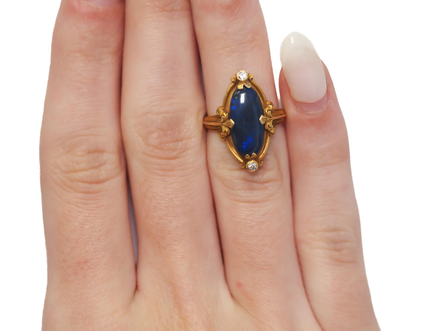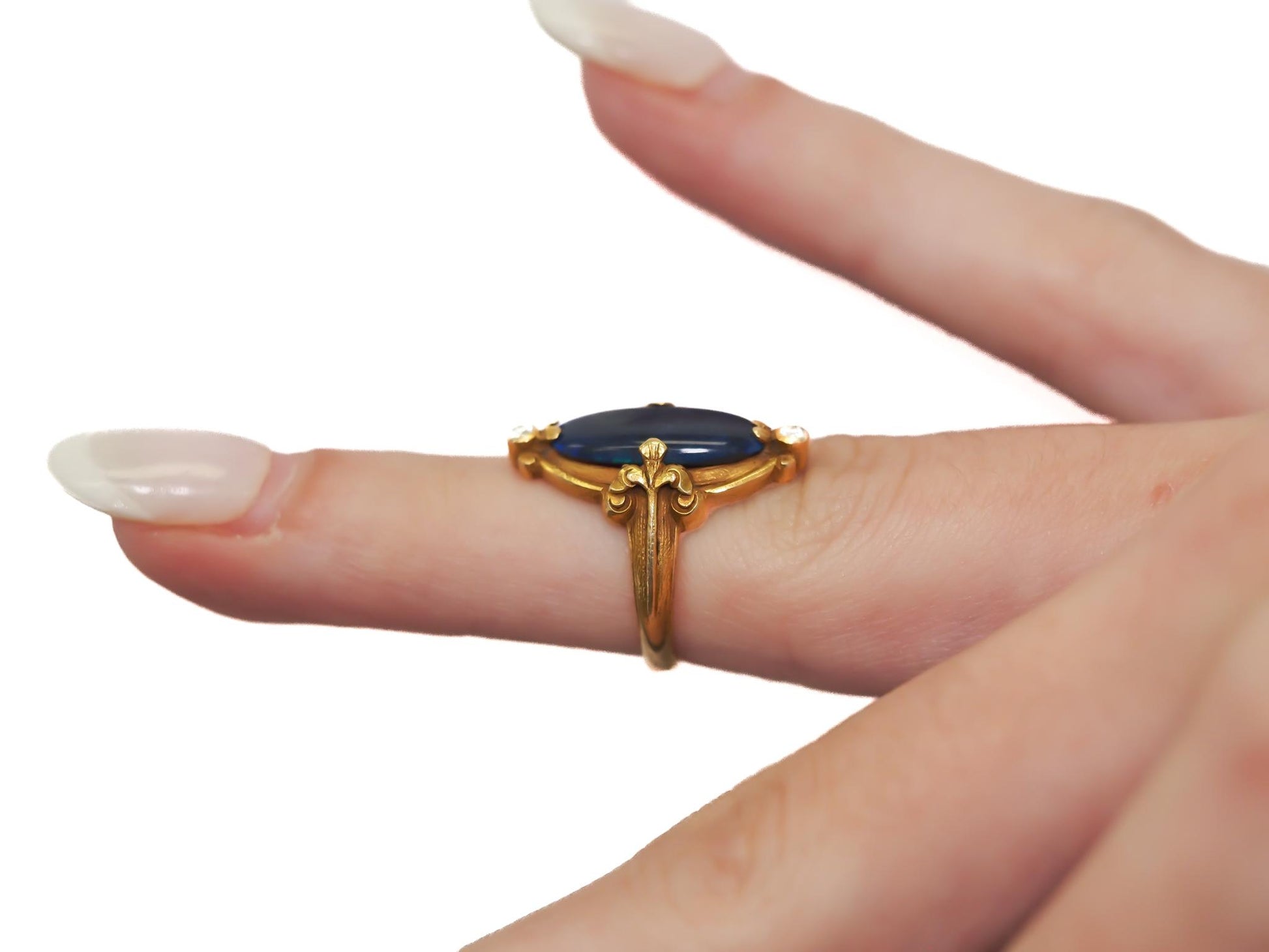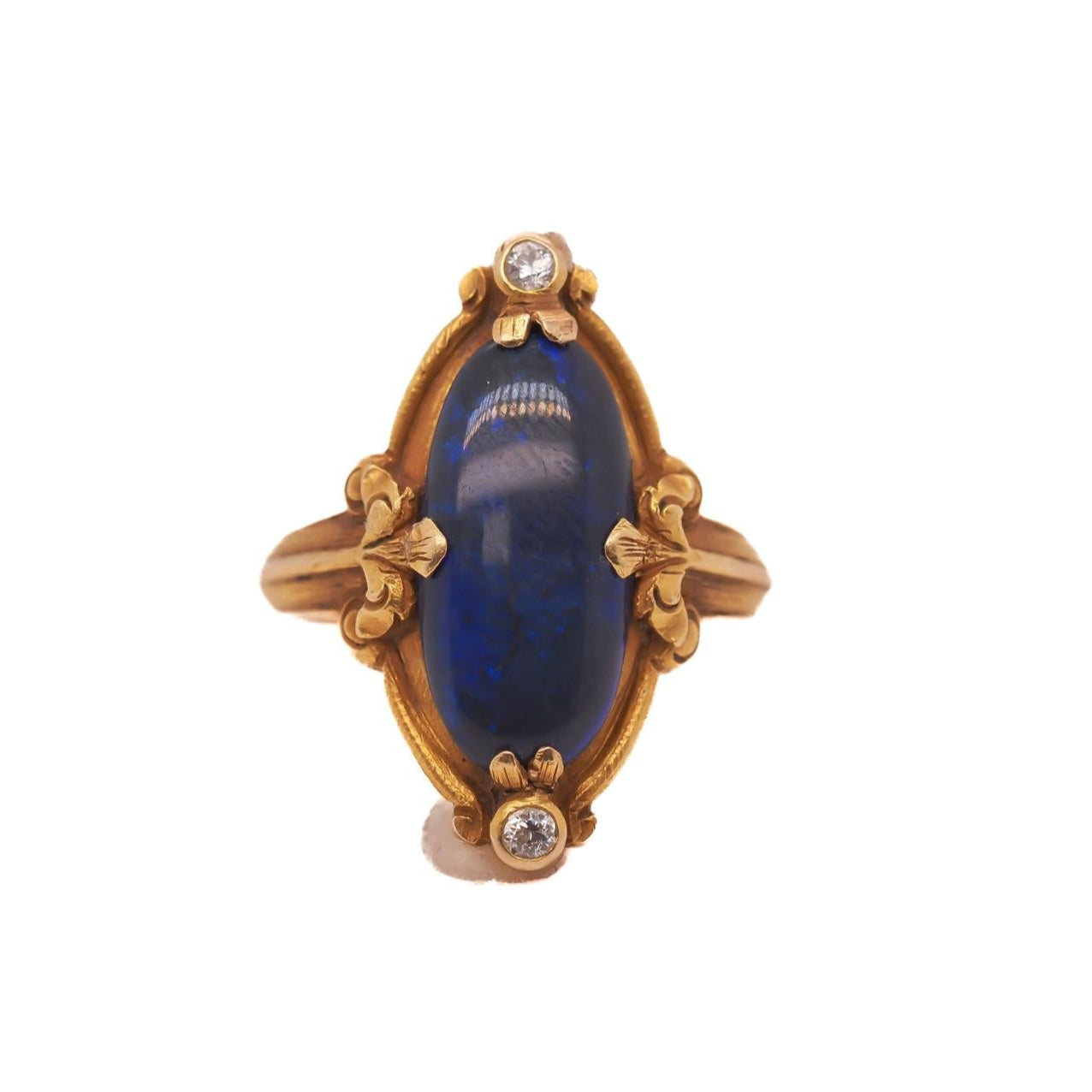Circa 1900s Art Nouveau 18K Yellow Gold Black Opal and Diamond Ring - VEG#2029a