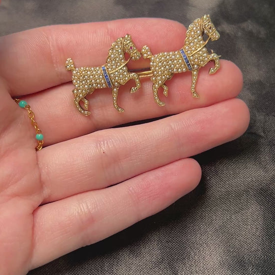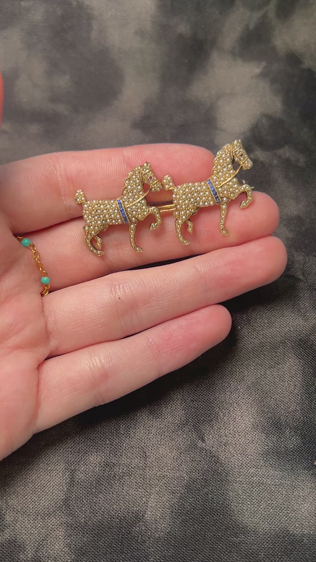 Estate 1900s 14K Yellow Gold Horse Brooch with Sapphire and Pearls - VHK#653a