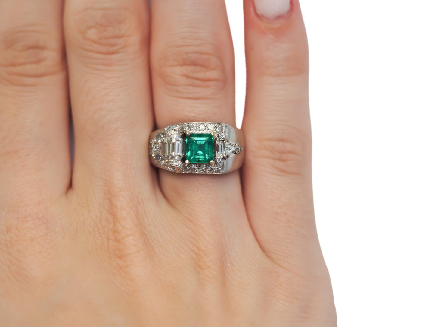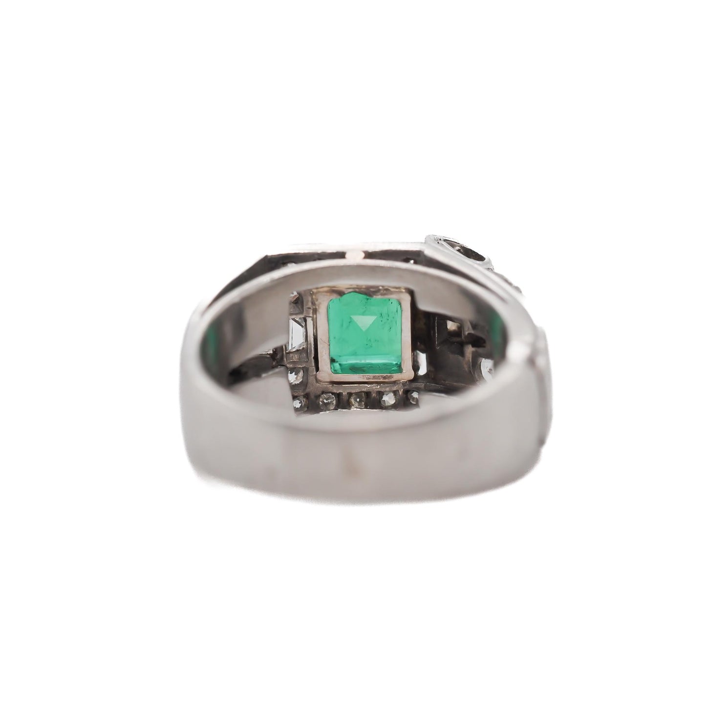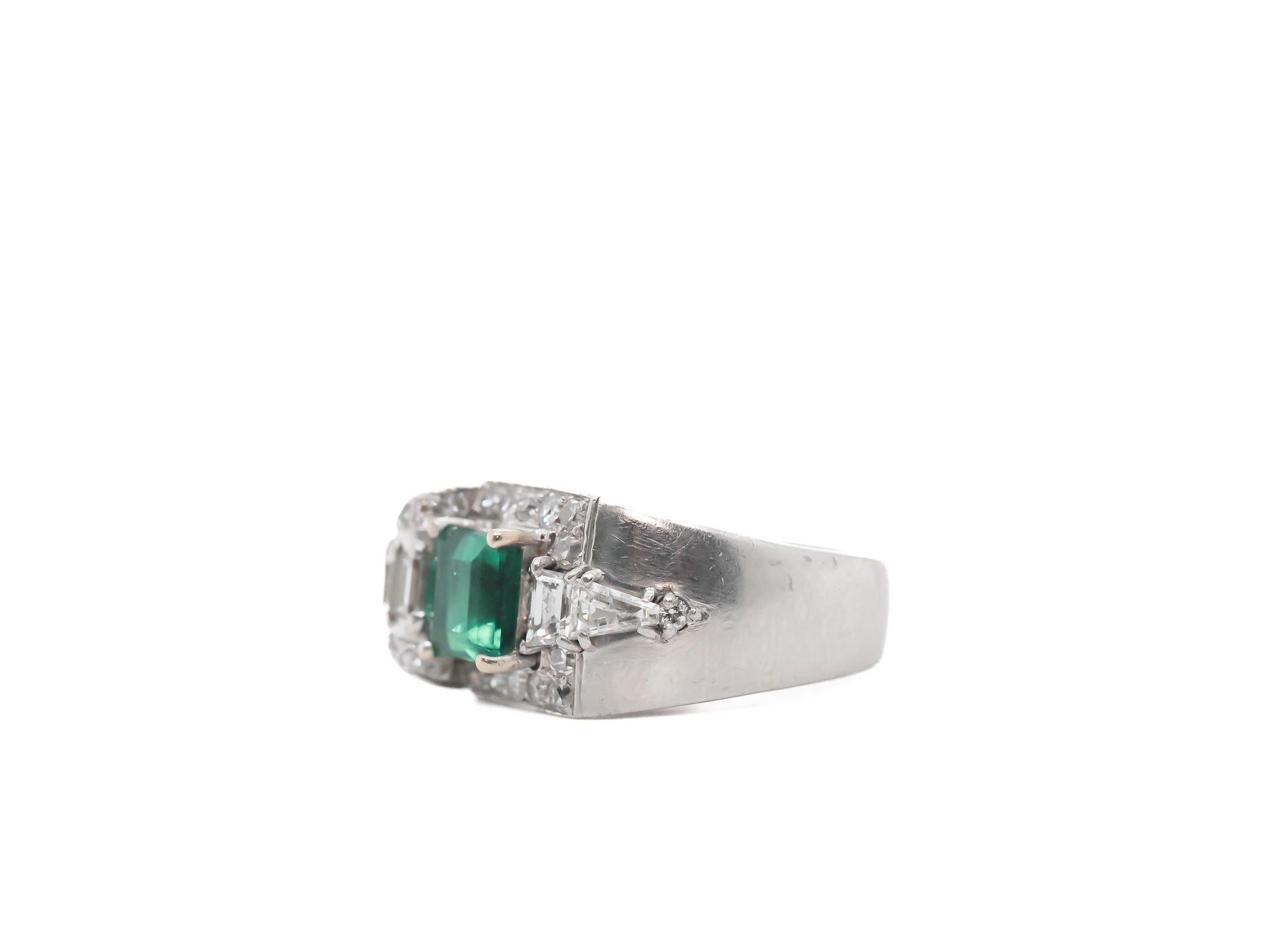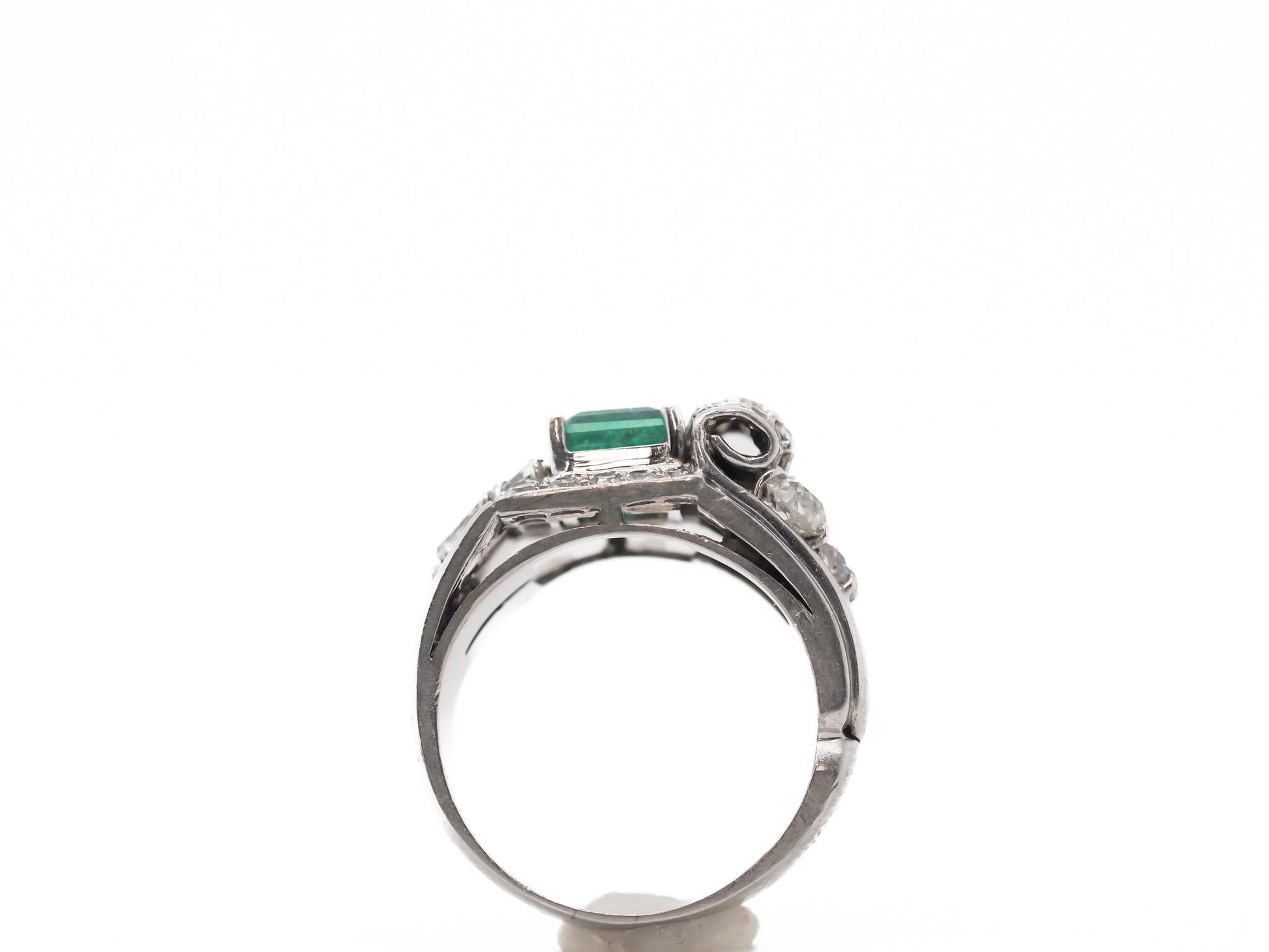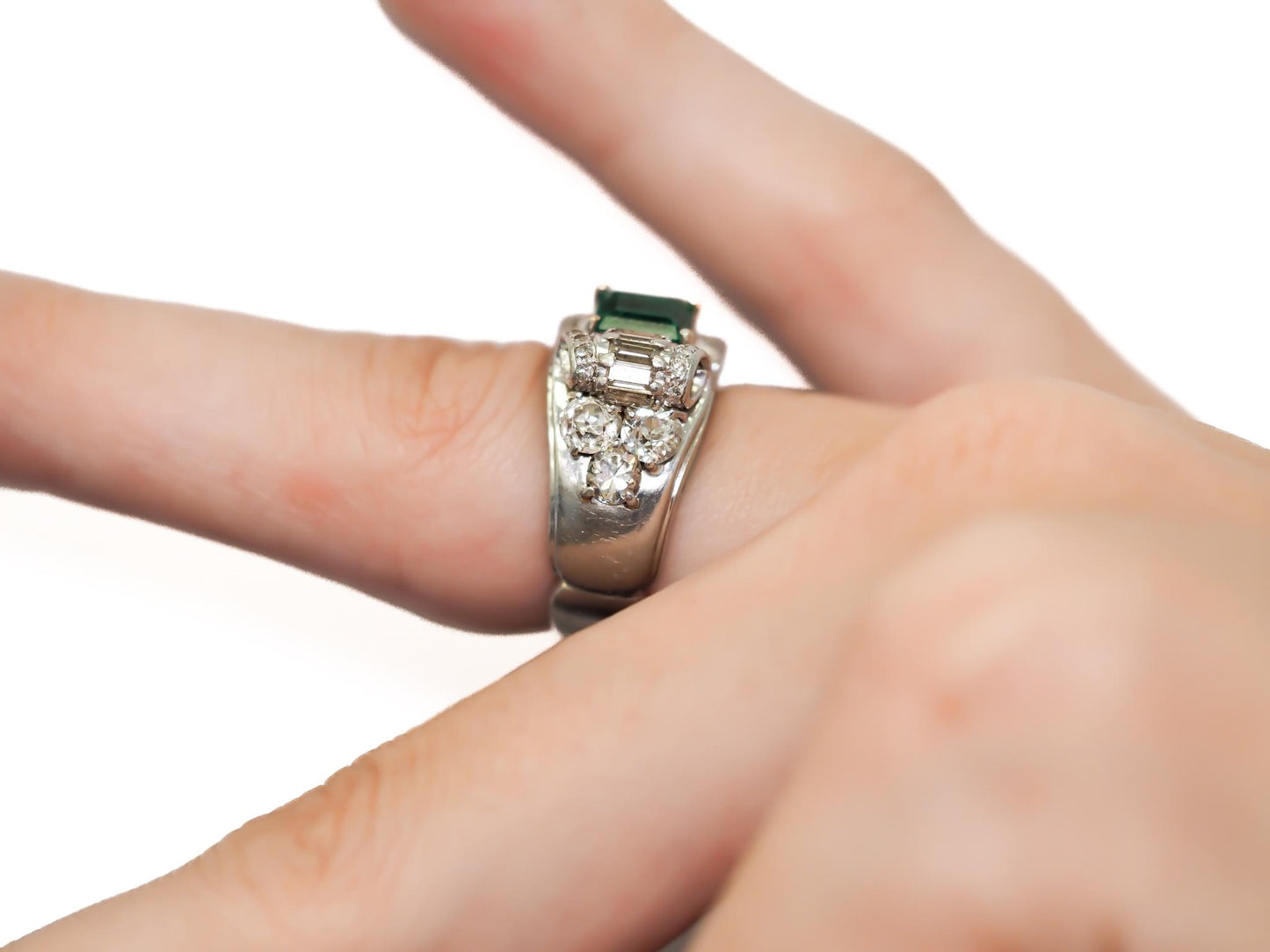 A bright and bold look was accomplished using eye-catching metal work combined with large diamonds and gemstones to create a style of geometric patterns and shapes. During the Art Deco years, yellow gold was not used often. Platinum, 18k and 14k white gold and sterling silver were most common. Colorful gemstones and gorgeous diamonds were used often in designs. Gemstones featured prominently in rings of the day, in addition to diamonds, included emeralds, sapphires, jade, black onyx and rubies. Crystal and mother-of-pearl were favored in ring designs throughout the Art Deco years as well and the channel setting was the most popular type of gemstone setting at this time. Art Deco diamond rings were generally made with stones cut with large top table facets and newer cuts such as baguettes, triangle cuts and emerald cuts. However, old world traditional diamond cuts are sometimes seen in Art Deco rings as well.