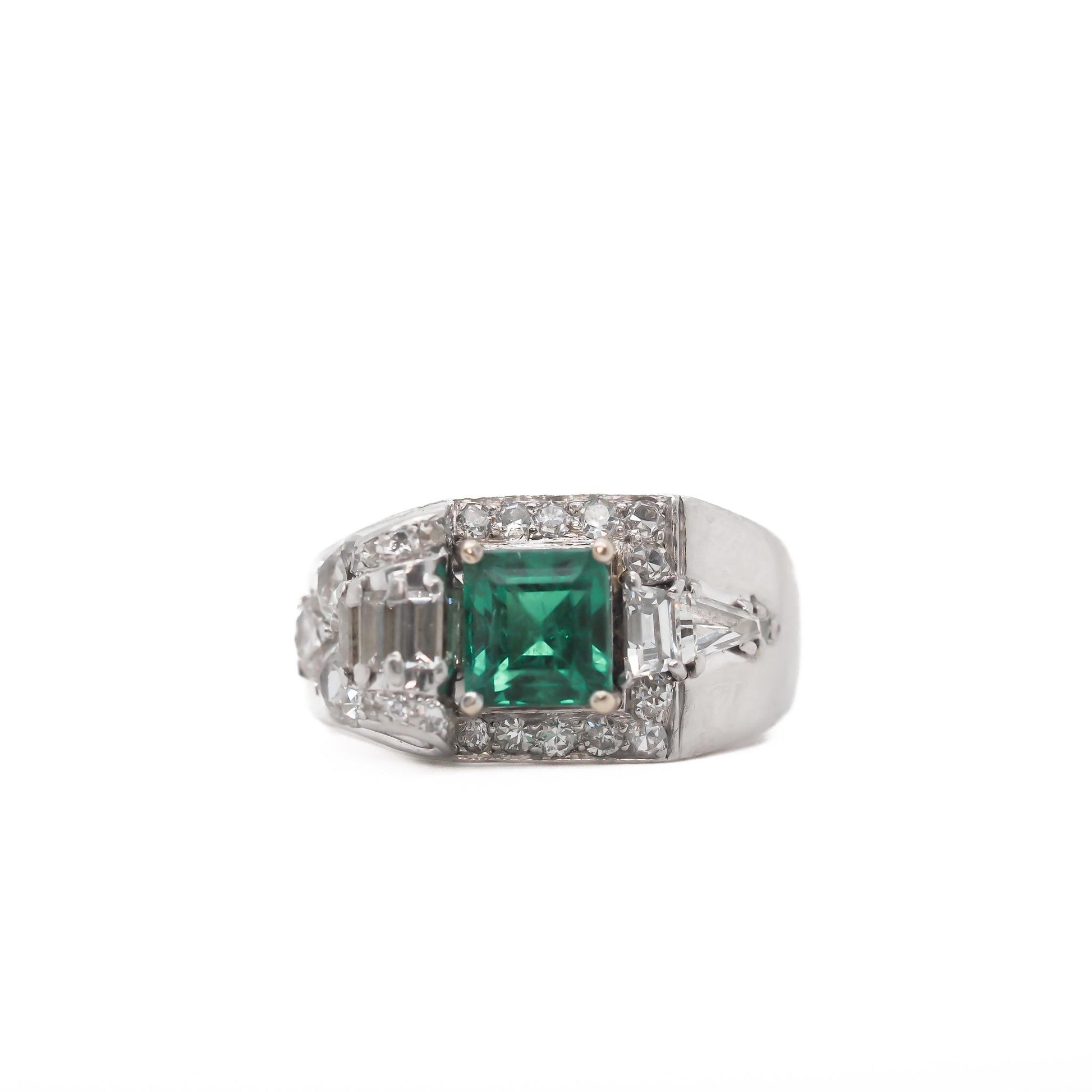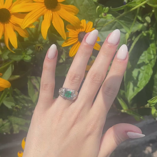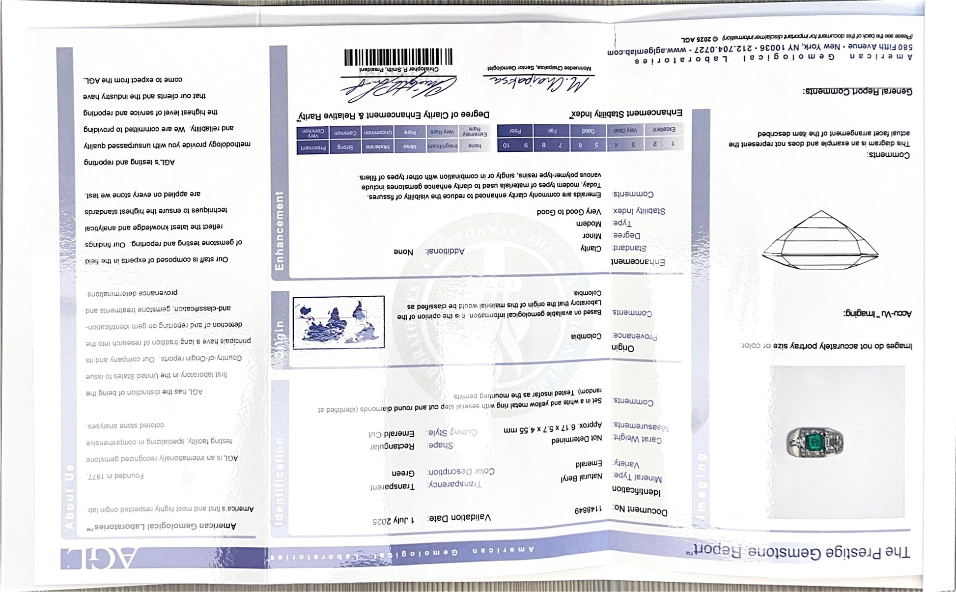 AGL Report: 1148849 Weight: 1.25ct approximate Cut: Emerald Origin & Clarity: Colombia, Minor Oil Type: Natural Diamond Details: .75ct total weight, Step Cut, and Old Mine Cut Diamonds, F Color, VS Clarity.