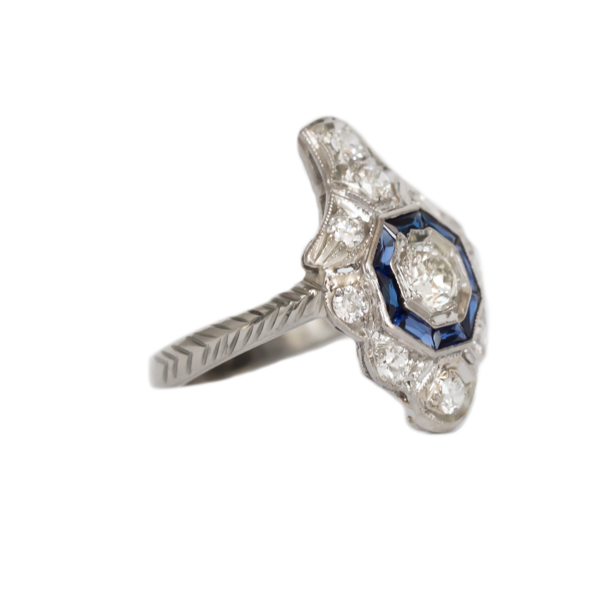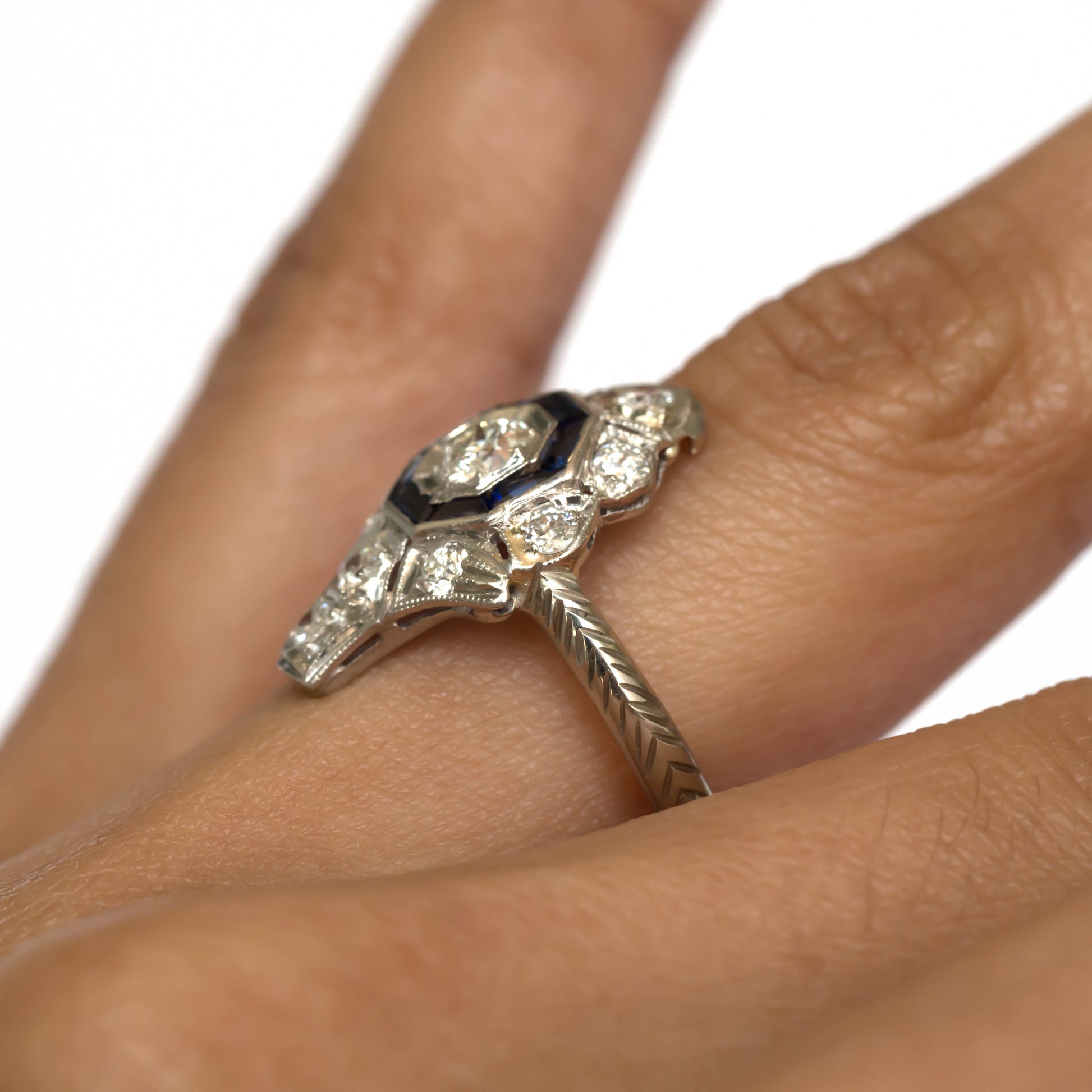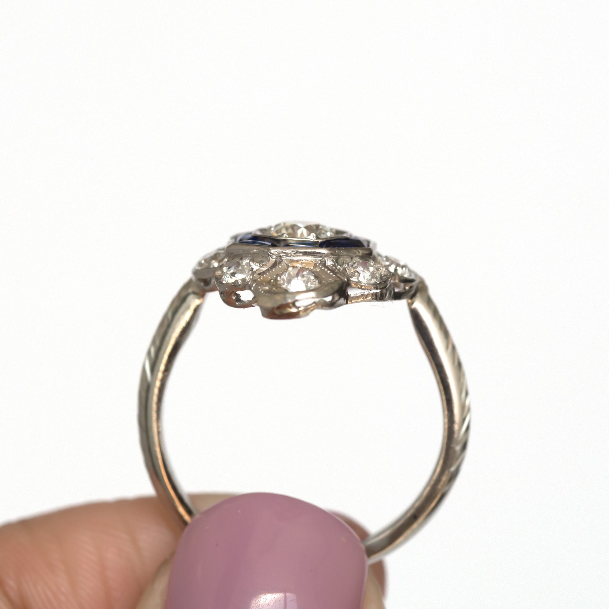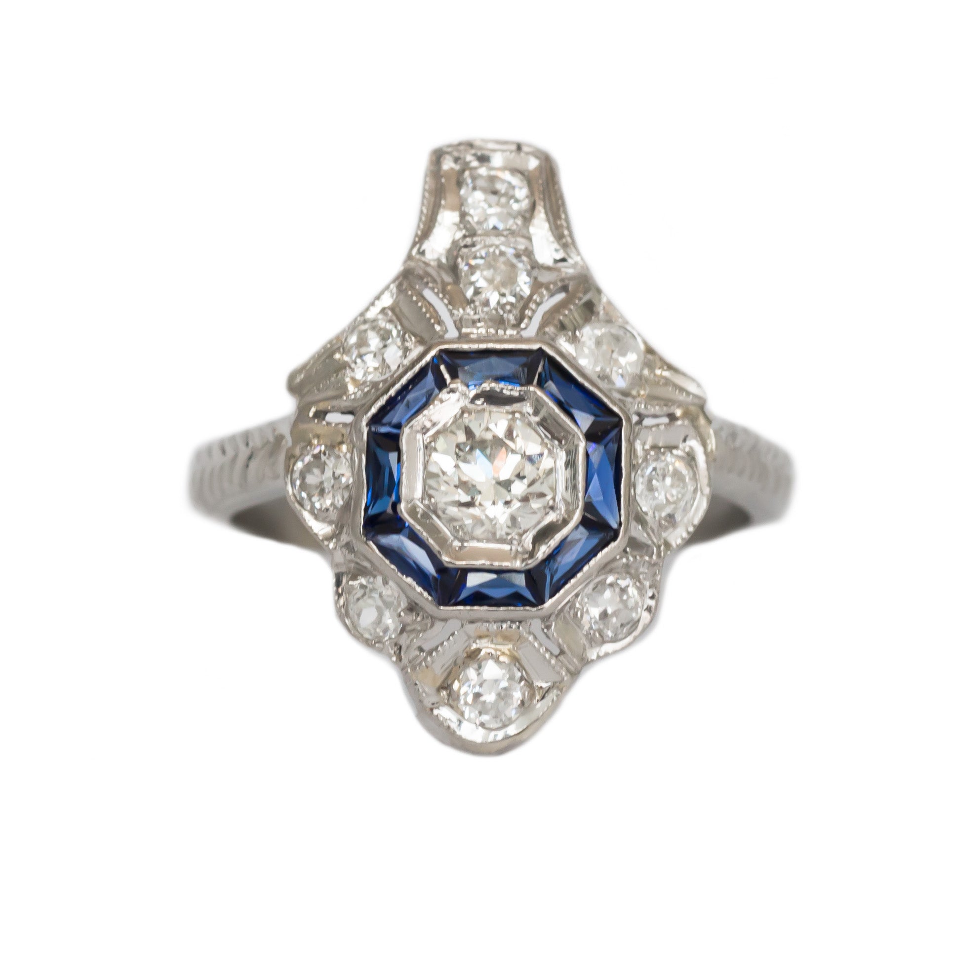 Here we have an 1930 Art Deco Platinum & 14k White Gold .25cttw Old European Brilliant Diamond and .20cttw French Cut Sapphire! A darling ring that is true to its era, wonderfully crafted to create a cluster of sparkle and shine!