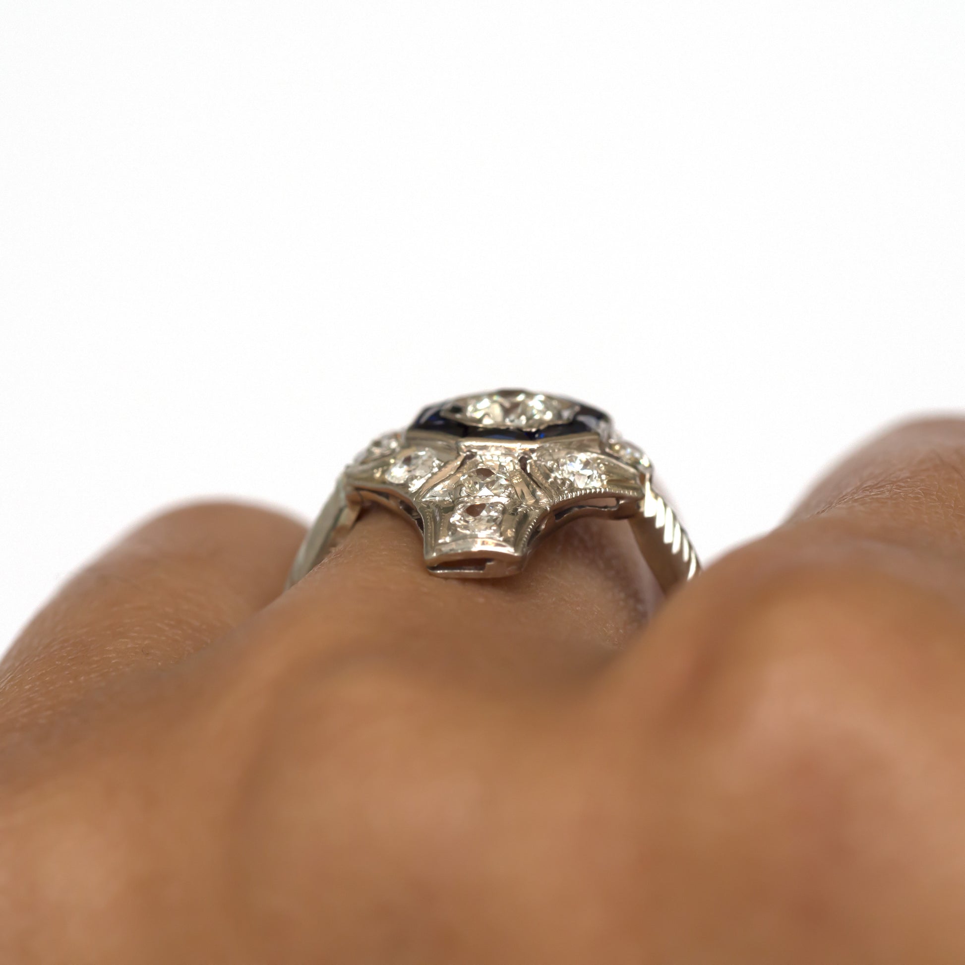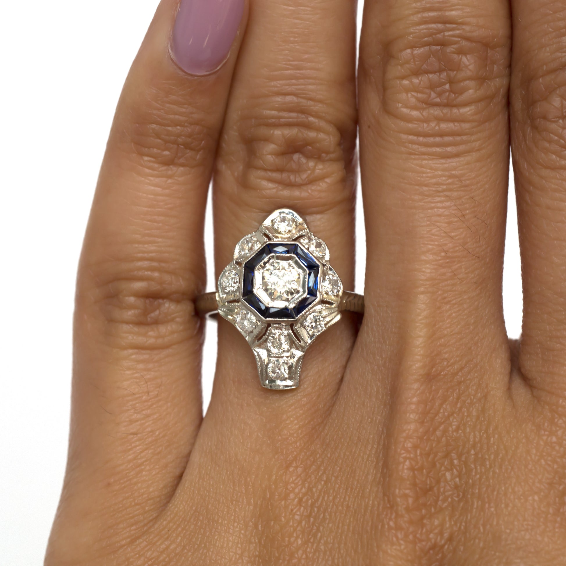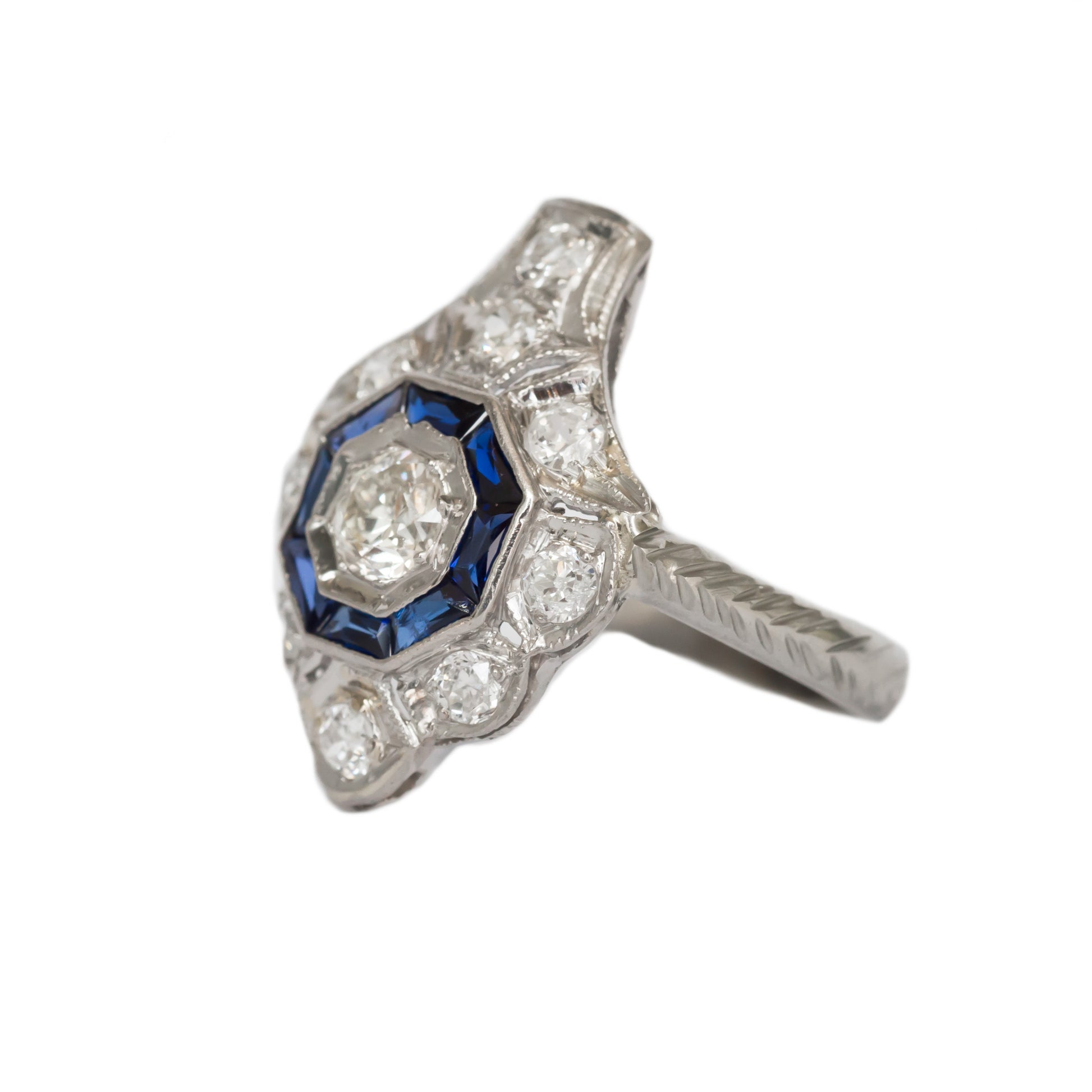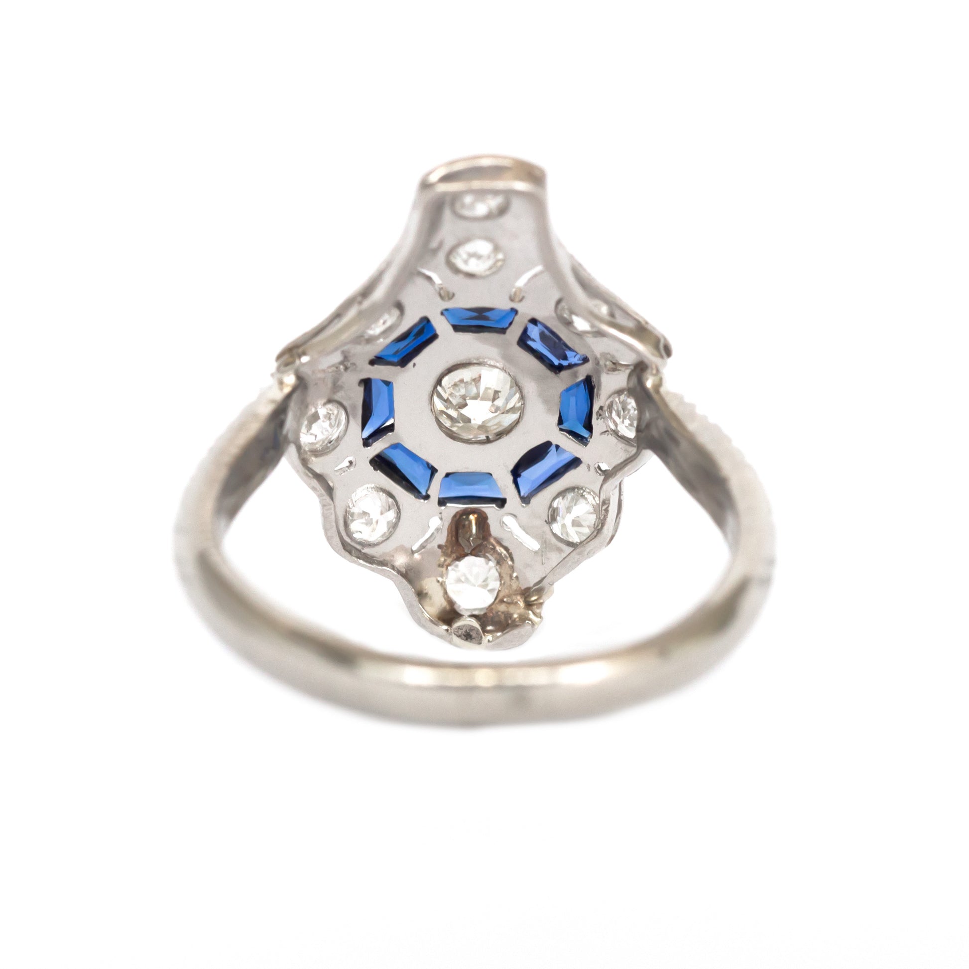 Here we have an 1930 Art Deco Platinum & 14k White Gold .25cttw Old European Brilliant Diamond and .20cttw French Cut Sapphire! A darling ring that is true to its era, wonderfully crafted to create a cluster of sparkle and shine!