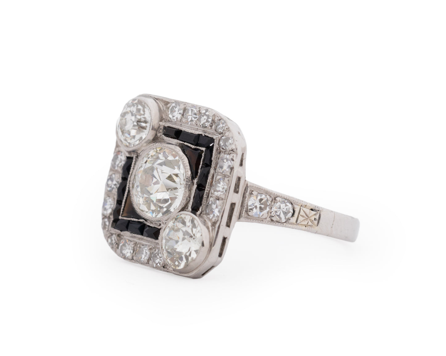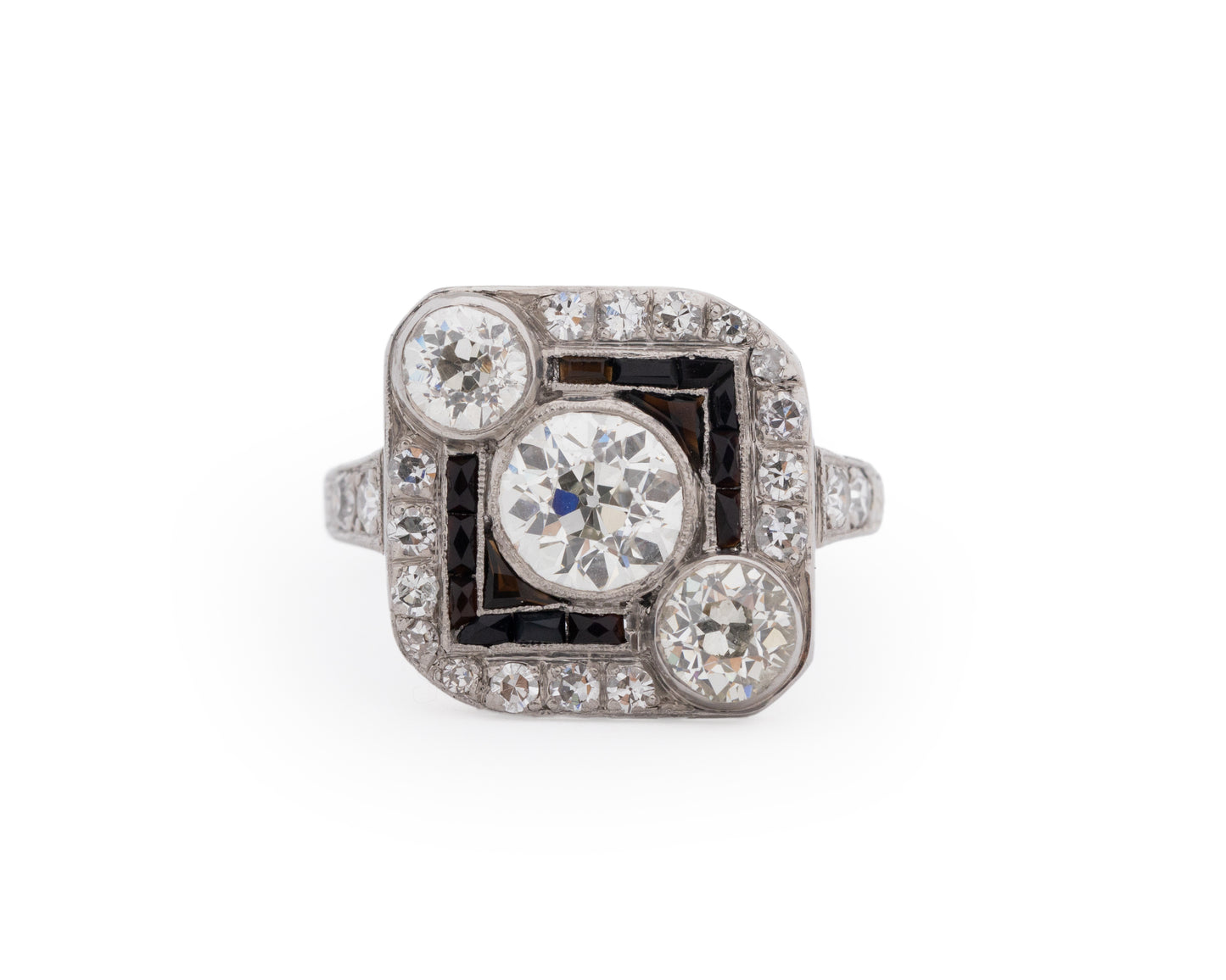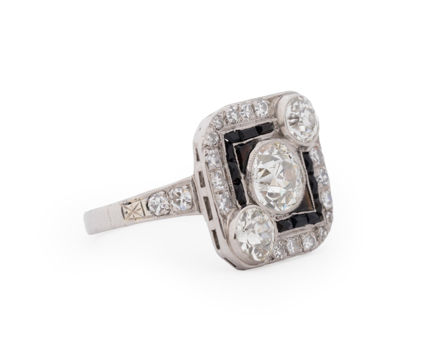 A bright and bold look was accomplished using eye-catching metal work combined with large diamonds and gemstones to create a style of geometric patterns and shapes. During the Art Deco years, yellow gold was not used often. Platinum, 18k and 14k white gold and sterling silver were most common. Colorful gemstones and gorgeous diamonds were used often in designs. Gemstones featured prominently in rings of the day, in addition to diamonds, included emeralds, sapphires, jade, black onyx and rubies. Crystal and mother-of-pearl were favored in ring designs throughout the Art Deco years as well and the channel setting was the most popular type of gemstone setting at this time. Art Deco diamond rings were generally made with stones cut with large top table facets and newer cuts such as baguettes, triangle cuts and emerald cuts. However, old world traditional diamond cuts are sometimes seen in Art Deco rings as well.