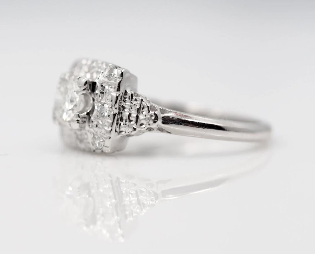 Here we have an absolutely Royal looking engagement ring. The center diamond is ultra white and clean, with a transitional old cut center diamond. The design of this ring makes the center stone look like it is sitting on a cushion of diamonds. There is hand carved metal work around the head of the ring as well. We polished this ring and restored it to like new condition! Circa 1950.