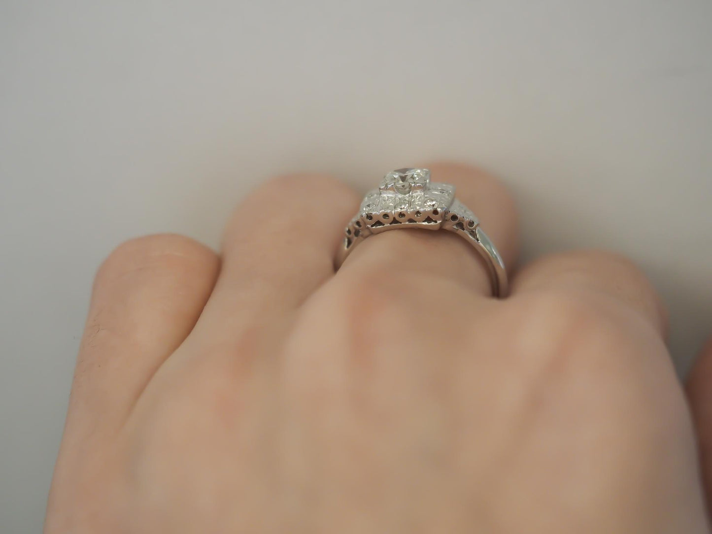 A bright and bold look was accomplished using eye-catching metal work combined with large diamonds and gemstones to create a style of geometric patterns and shapes. During the Art Deco years, yellow gold was not used often. Platinum, 18k and 14k white gold and sterling silver were most common. Colorful gemstones and gorgeous diamonds were used often in designs. Gemstones featured prominently in rings of the day, in addition to diamonds, included emeralds, sapphires, jade, black onyx and rubies. Crystal and mother-of-pearl were favored in ring designs throughout the Art Deco years as well and the channel setting was the most popular type of gemstone setting at this time. Art Deco diamond rings were generally made with stones cut with large top table facets and newer cuts such as baguettes, triangle cuts and emerald cuts. However, old world traditional diamond cuts are sometimes seen in Art Deco rings as well.
